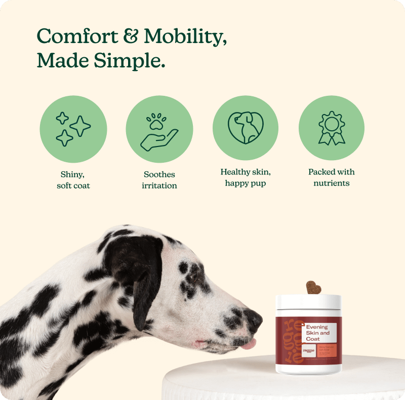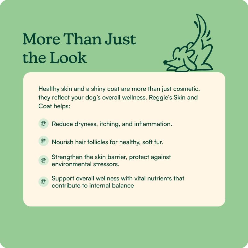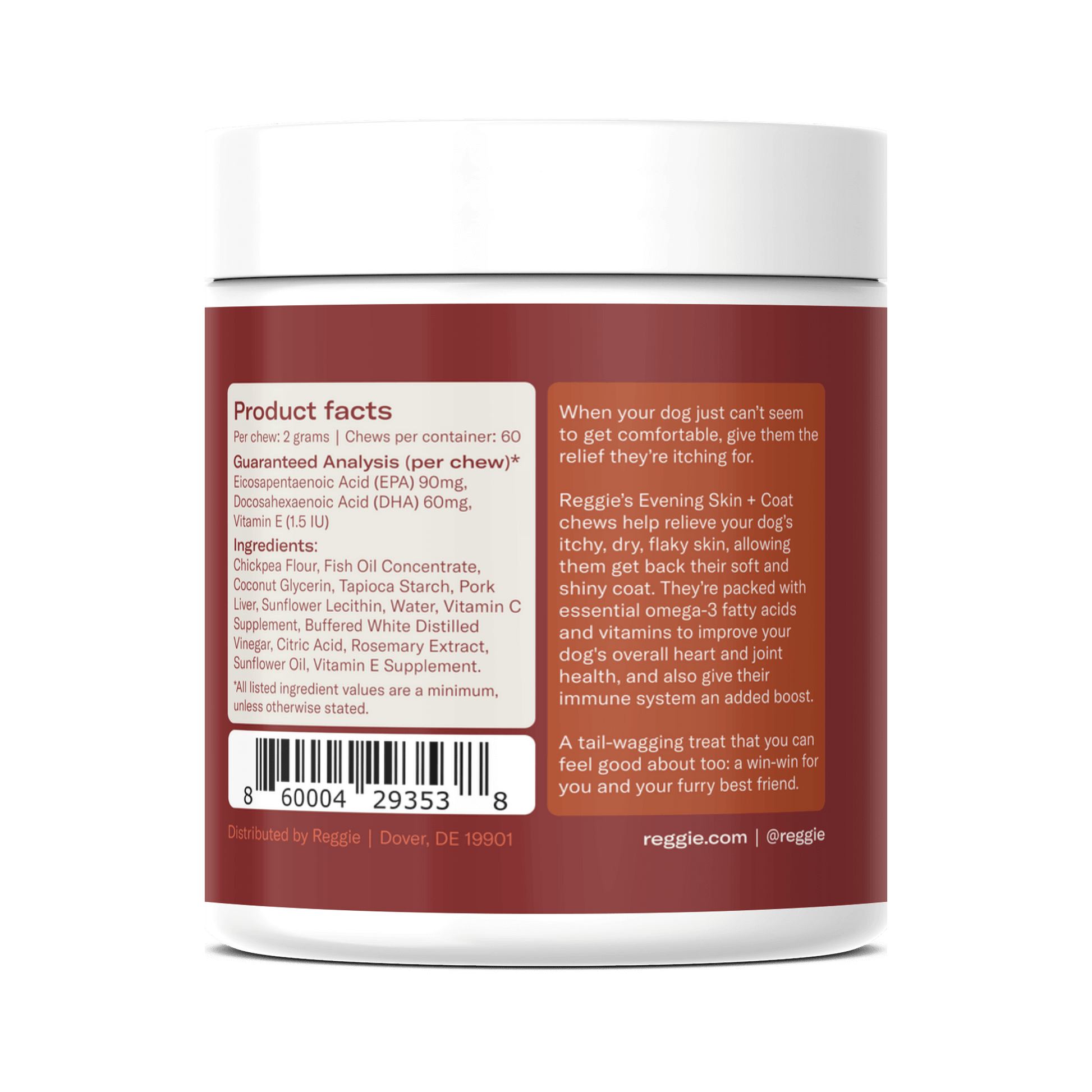 Rich in Omega 3 fish oils (EPA & DHA) and Vitamin E, Reggie's Skin + Coat chews help improve your dog's circulation and overall cardiovascular health.