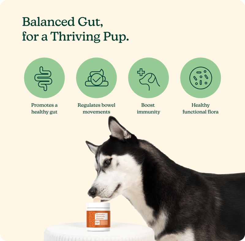 Probiotics to support a healthy gut & digestion, packed in a tasty pumpkin powder your pups will love